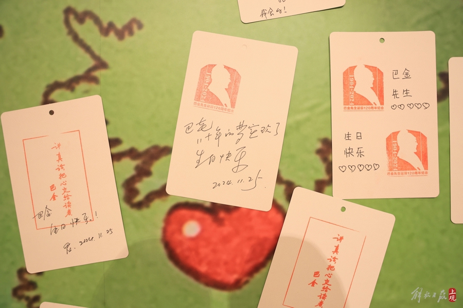 “巴金先生,生日快乐!”读者寄语被张贴在一颗生机盎然的“好大一棵树”上。