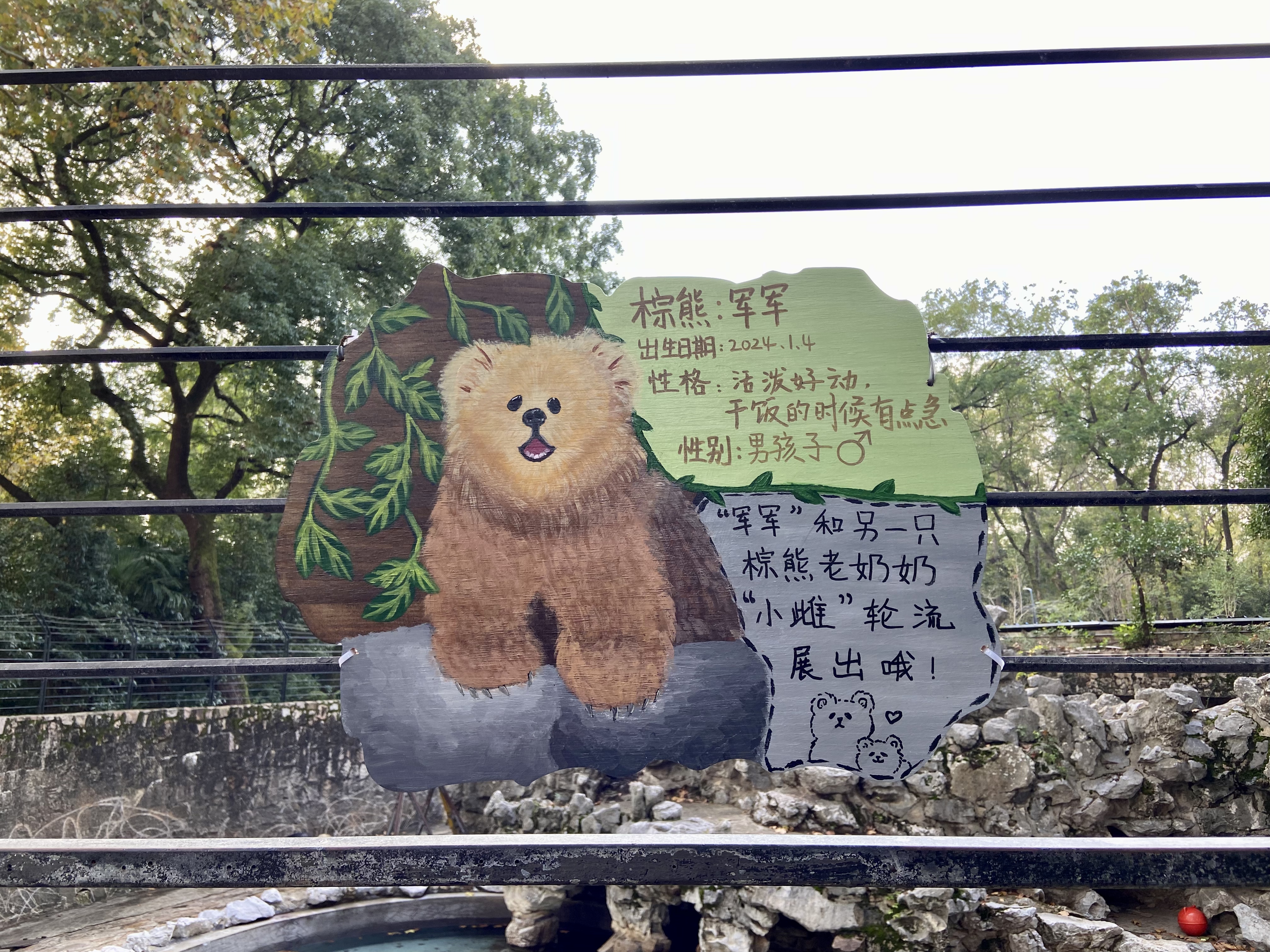 志愿者绘制的小棕熊“军军”展示牌。澎湃新闻记者 陈悦 图