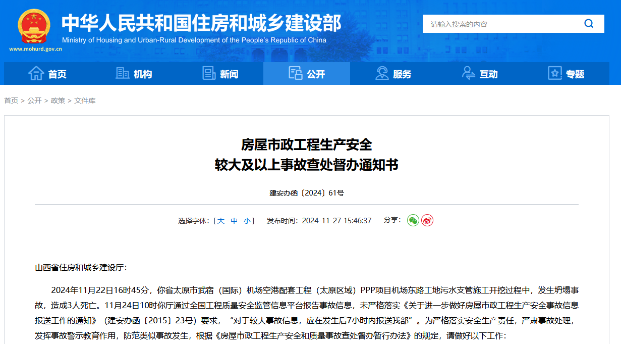 《通知书》提到,11月22日下午,山西省太原市武宿(国际)机场空港配套工程(太原区域)PPP项目机场东路工地污水支管施工开挖过程中,发生坍塌事故,造成3人死亡。由于山西省住房和城乡建设厅未能按照要求在事故发生七小时内将信息报送,住房和城乡建设部将对其进行工作约谈。