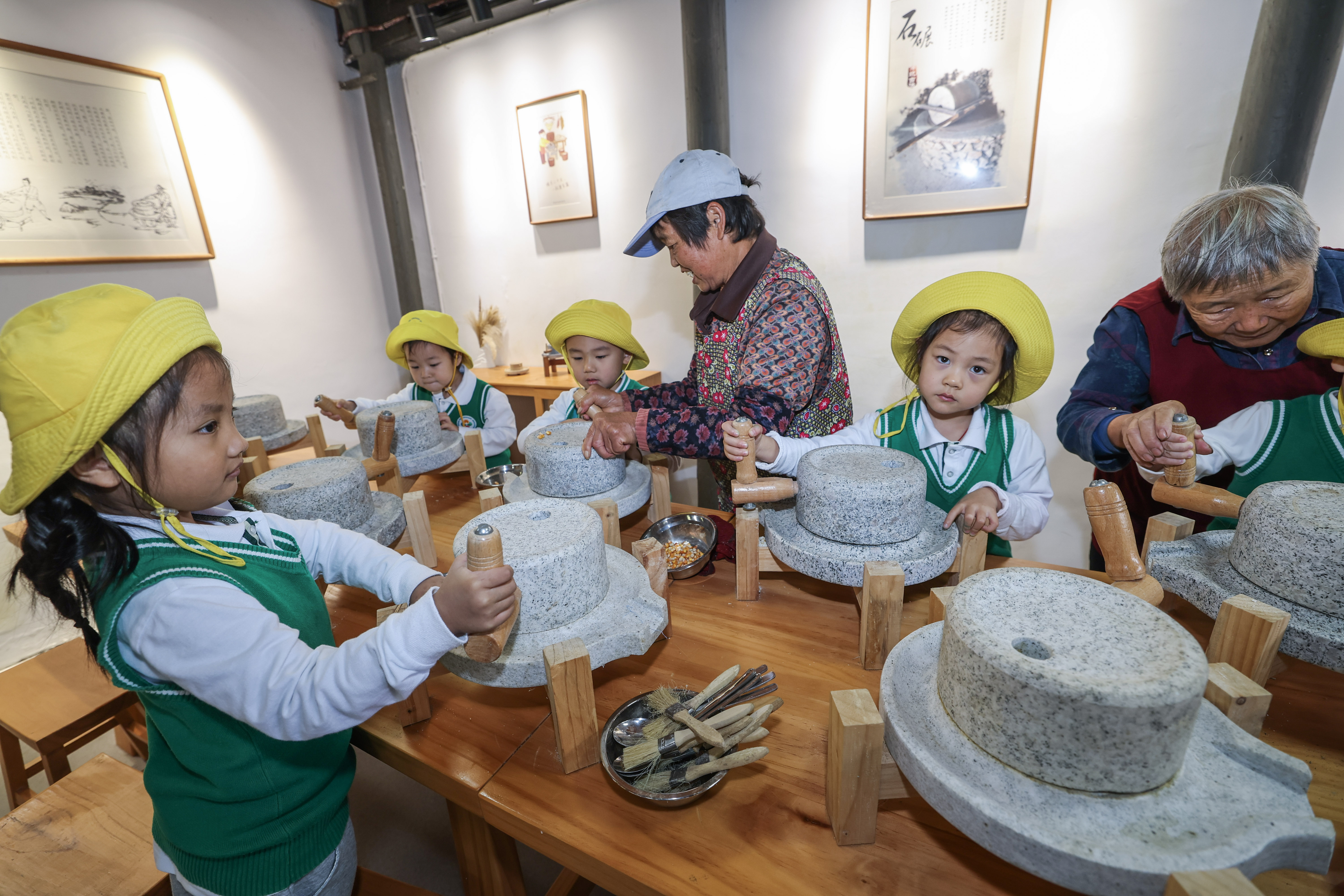2024年10月30日,参加研学游的诸暨荣怀和泰幼儿园的孩子们在璜山镇溪北村研学基地体验传统石磨。 新华社记者 徐昱 摄