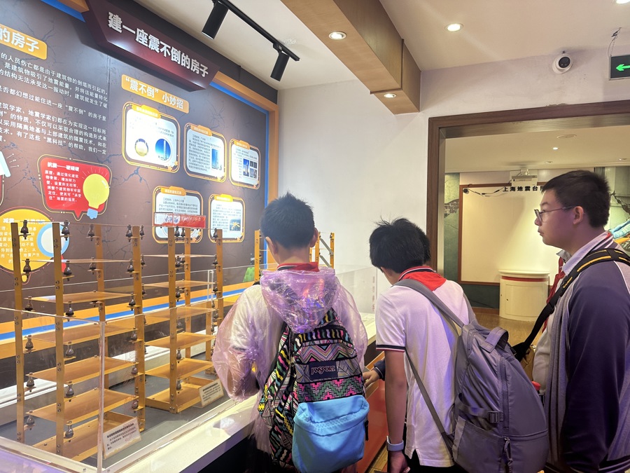 在一处互动装置前,八年级学生方同学和他的朋友们迅速被吸引,簇拥在一起琢磨“如何建一座震不倒的房子”。“这是我第一次如此近距离地学习和了解地震知识,留下了非常深刻的印象。”他说。