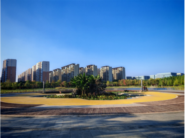 让人惊喜的是,园内水系利用一分干渠自然活水,形成现有约2万㎡的水系。水面中央有一座人工假山,配有水系驳岸景石、水生植物等,让人眼前一亮,水里有红鲤鱼你追我赶,水面上有水鸟捕食嬉戏。时光就这样缓缓流过指尖,静享岁月的美好。