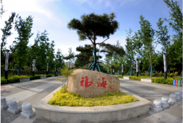 福海公园原貌是一片老旧的砂石厂房,白天尘土飞扬,噪声冲天,周边居住环境非常恶劣。公园在完善环城生态建设的基础上,使水体、绿化及周边用地能更好的融合在一起,绿化景观注重“大绿量、大尺度、大密度”的景观效果,步道蜿蜒穿行在公园中,游客可以在此漫步、跑步或骑行,与自然亲密接触。公园中央,一座大型的人工湖如明镜般倒映着周围的树影和蓝天,湖边设有休闲座椅,供人们静坐,享受自然的宁静。