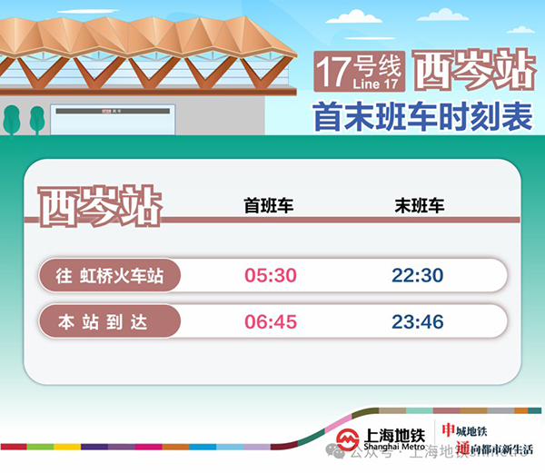 西岑站通车后将作为17号线西端终点站。首末班车方面,西岑站往虹桥火车站站首班车时间为05:30,末班车时间为22:30;虹桥火车站站始发首班车到达西岑站时间为06:45,虹桥火车站站始发末班车到达西岑站时间为23:46。