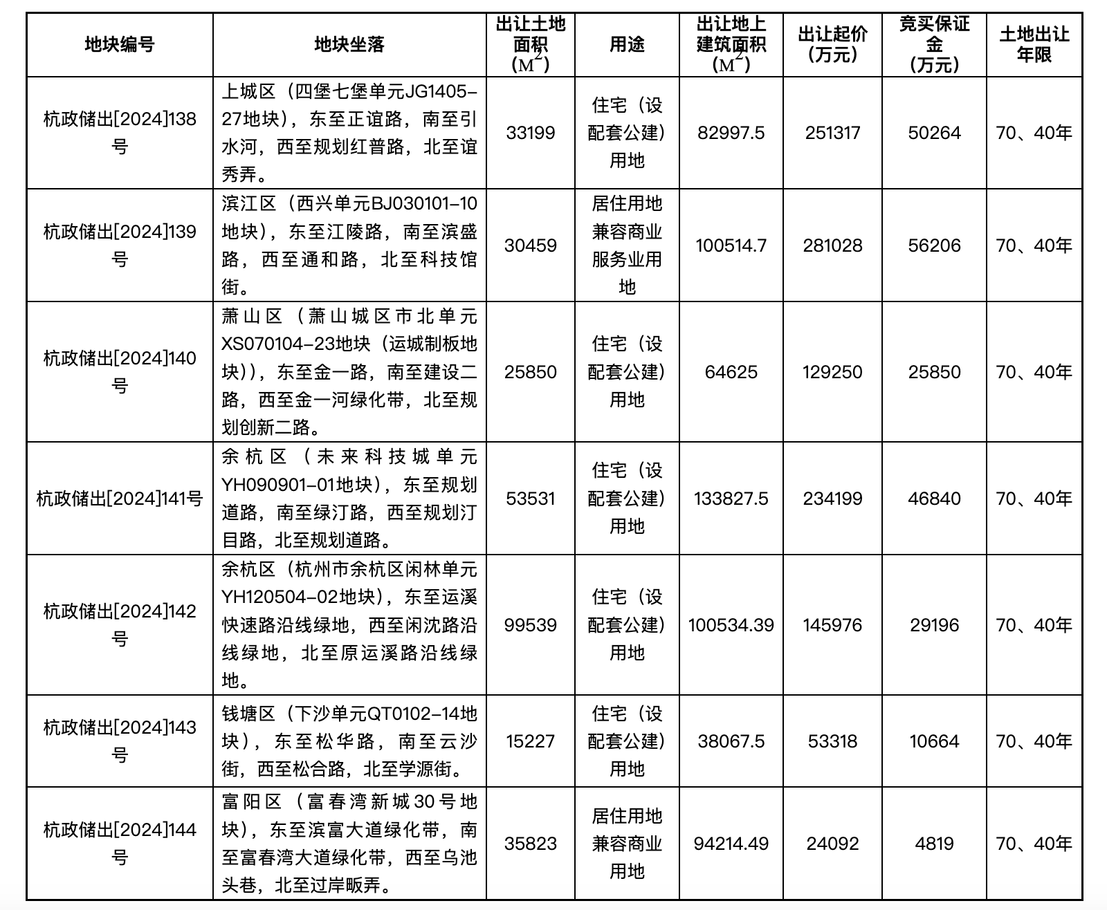 萧山区、富阳区、钱塘区则分别供应一宗地块,共计起始价约20.67亿元。