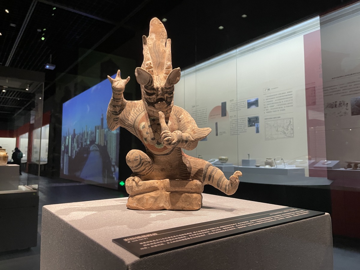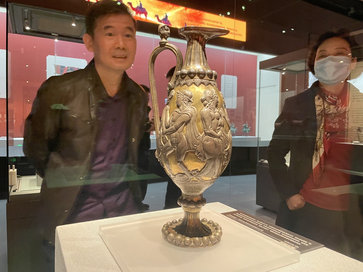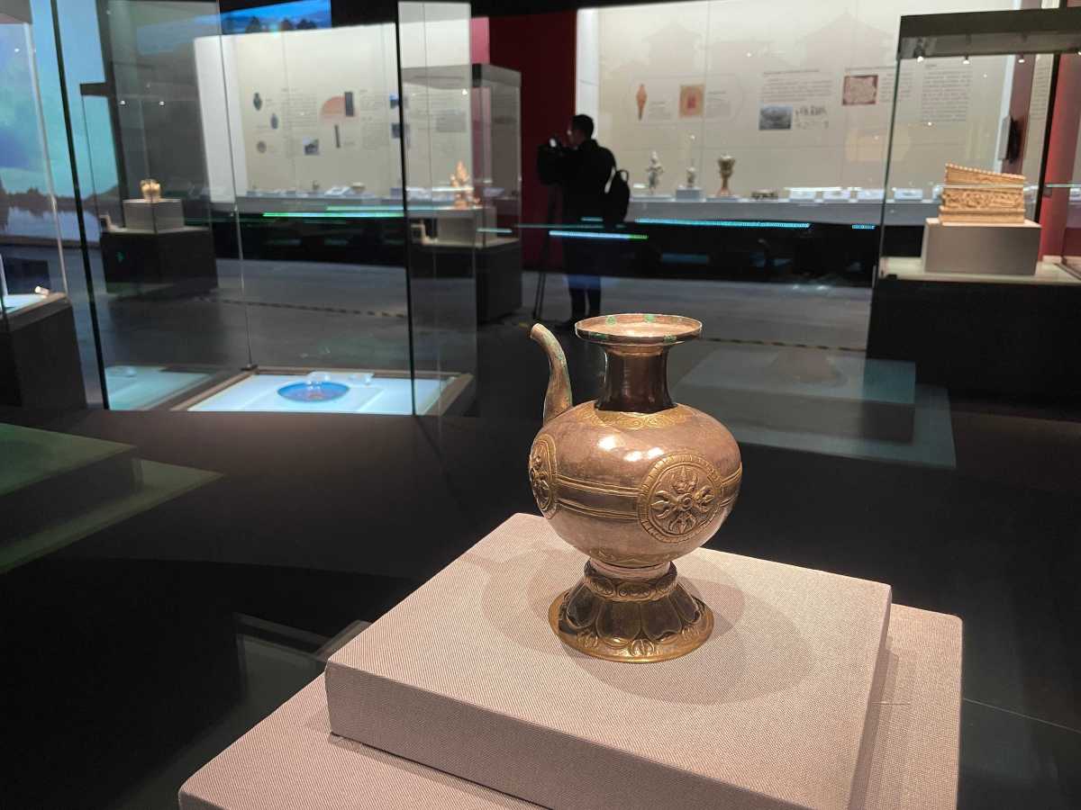 “晋归义羌侯”金印,体现中原王朝与周边少数民族政权之间的关系;宁夏固原县南郊乡深沟村李贤夫妇墓出土的鎏金银壶,是目前我国境内出土最早的鎏金银壶,瓶身共三组人物故事,分别是帕里斯审判、掠夺海伦和回归的场面,从制作工艺来看,为萨珊系金银器的精品之作。广西合浦(今北海)黄泥岗墓出土的东汉水晶、绿柱石混合串珠,广州地区出土的东汉陶船等文物,则向观众讲述着早期“海丝”港口故事。宁波的句章故城、早期佛教传播与青瓷生产故事也在该板块一同呈现。