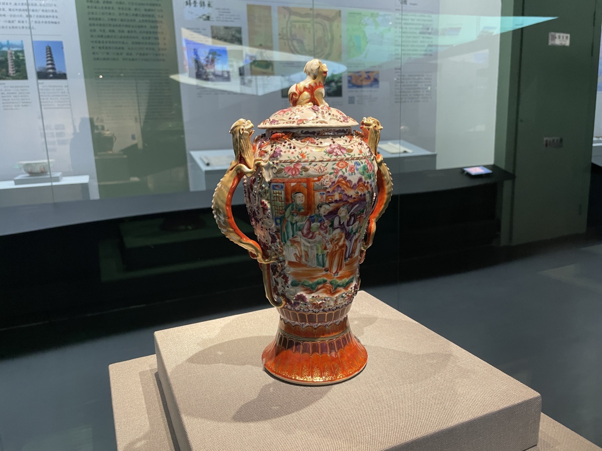 这一时期可以看到许多中西合璧风格的展品,例如清乾隆年间的广彩人物故事图带盖奖杯、瑞典“William Chambers”家族纹章纹咖啡壶、广彩开窗希腊神话纹瓷碗等。展出中,还有多艘沉船复原模型,直观讲述“海上丝绸之路”扬帆起航的故事。