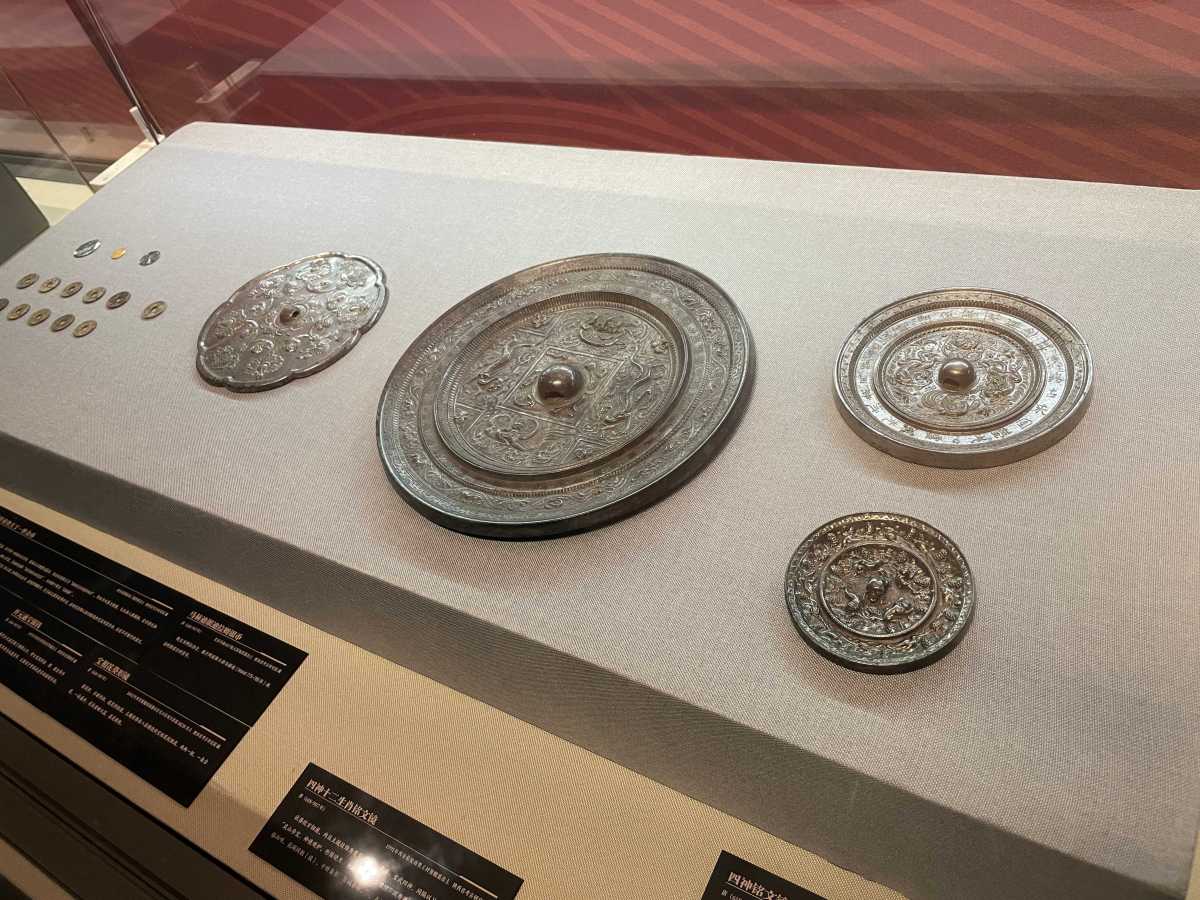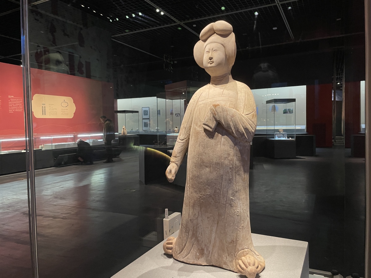 该板块展出了多件骑马俑,体现了唐代独特的时代风尚。其中,昭陵博物馆藏张士贵墓出土的唐戴阔沿幂篱帽女骑马俑,反映了唐初统治者要求妇女骑马出行时戴用幂篱的一种风俗;阿斯塔那墓出土的彩绘侍役坐姿女泥俑,似侍女劳作后小憩的场景,生动传神;陕西省考古研究院藏的唐代东罗马皇帝查士丁一世金币,是丝绸之路上货币的代表;多面唐镜、彩绘镇墓兽与法门寺地宫出土金银器,也充分反映时代特征。