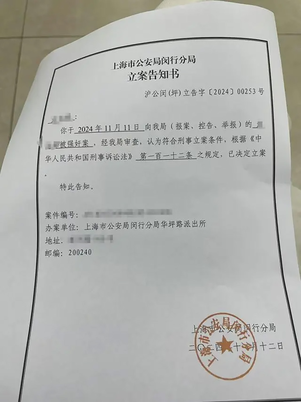 上海市公安局闵行分局立案告知书显示:你于2024年11月11日向我局(报案、控告、举报)的被强奸案,经我局审查,认为符合刑事立案条件,根据《刑事诉讼法》第一百一十二条之规定,已决定立案。