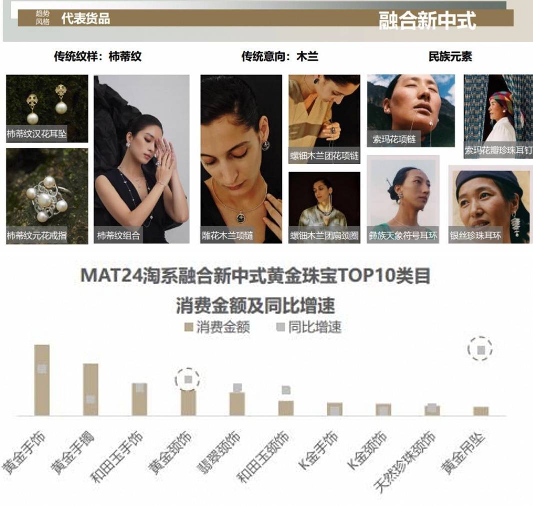 结合站内外消费者行为数据分析,报告总结了2024年秋冬珠宝饰品四大代表风格:融合新中式、野心大女主、静奢轻珠宝和复古少女风。从去年开始,新中式风格走红,东方韵味受到消费者的热捧,如今,这股风潮刮到了珠宝领域。