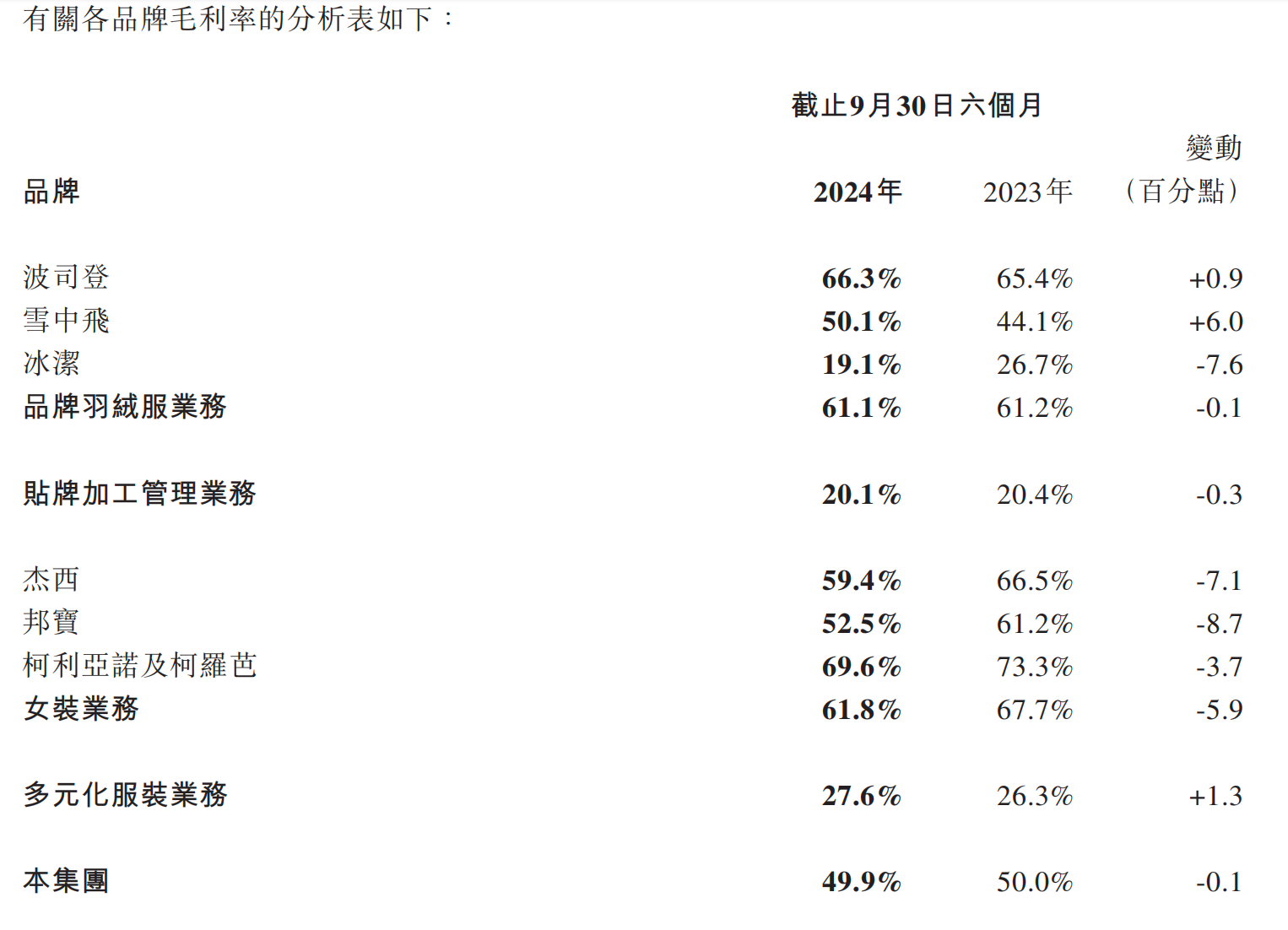毛利率方面,上半财年集团整体毛利率小幅下降0.1个百分点至49.9%。财报指出,由于产品结构、品牌收入结构及原材料成本的变动,带动品牌羽绒服业务板块毛利率小幅下降。