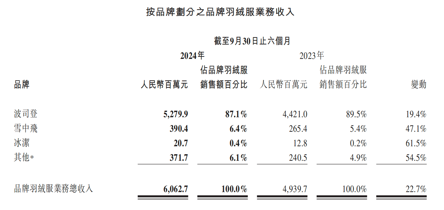 其中,波司登品牌收入同比上升19.4%,达52.8亿元,占比羽绒服业务超87%。另外的两个品牌,业务占比6.4%的雪中飞品牌收入同比增长47.1%,业务占比0.4%的冰洁品牌收入同比上升61.5%。