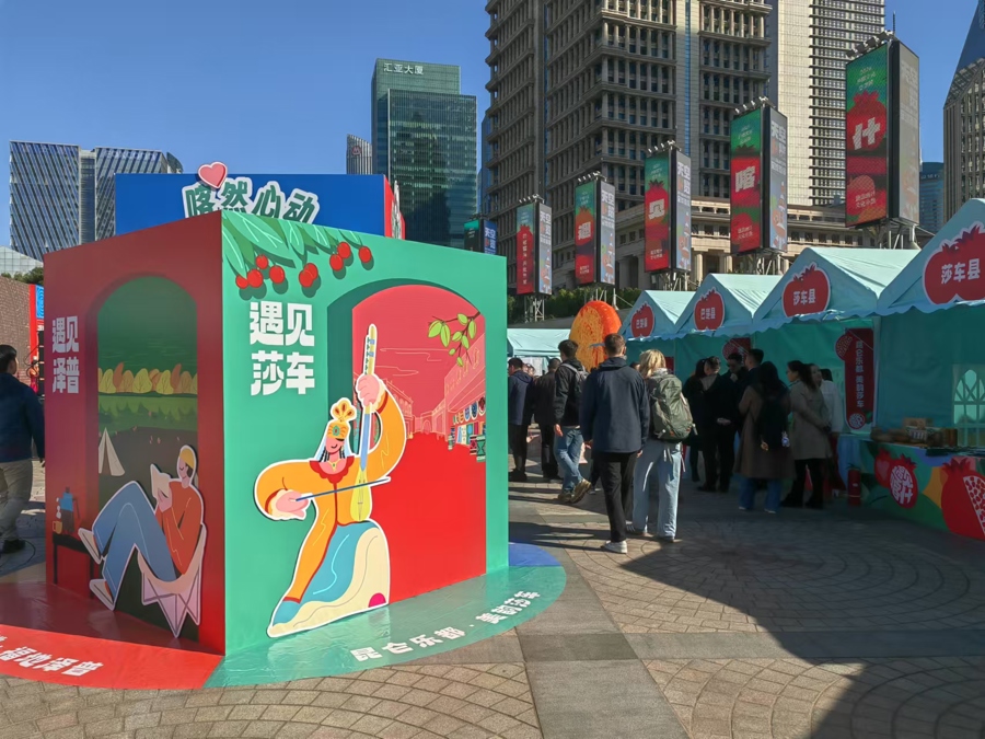 “今天所有的东西都是新鲜发货,不需要门店预约,价格更便宜……”走进位于上海东方明珠塔城市广场的“遇见喀什”文化市集,门口就能看到举着手机、端着产品卖力吆喝的直播带货达人。市集上,来自上海对口支援的喀什四县(莎车、泽普、叶城、巴楚)的传统手工艺、非遗、美食物产、民族服饰,以及今年上海文化润疆成果摆成两排,为市民游客提供近距离感受喀什文化和上海文化润疆工作的平台。喀什与上海本地的艺术团体同台献艺,还有根据石榴、烤馕等新疆特色美食设计的打卡区域吸引市民游客互动留念。