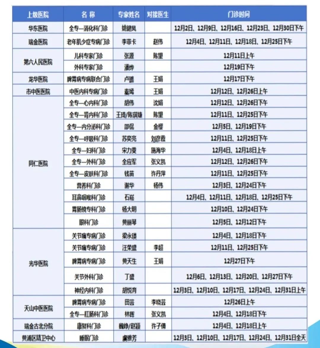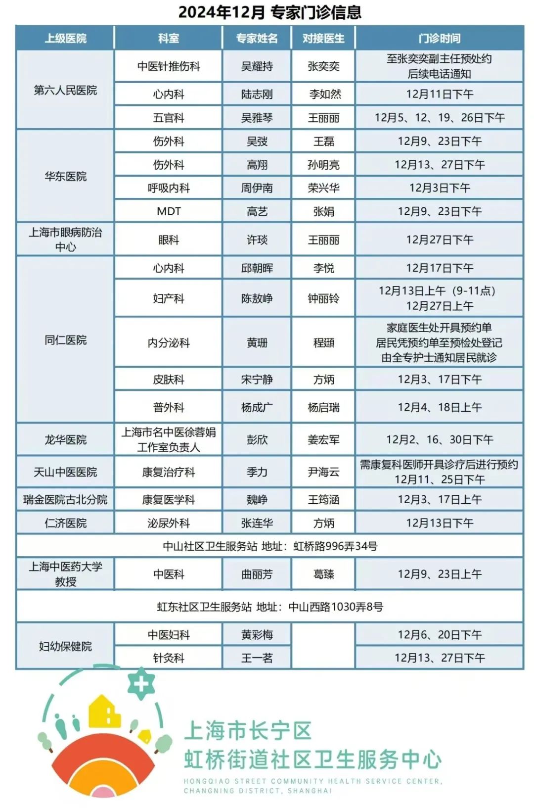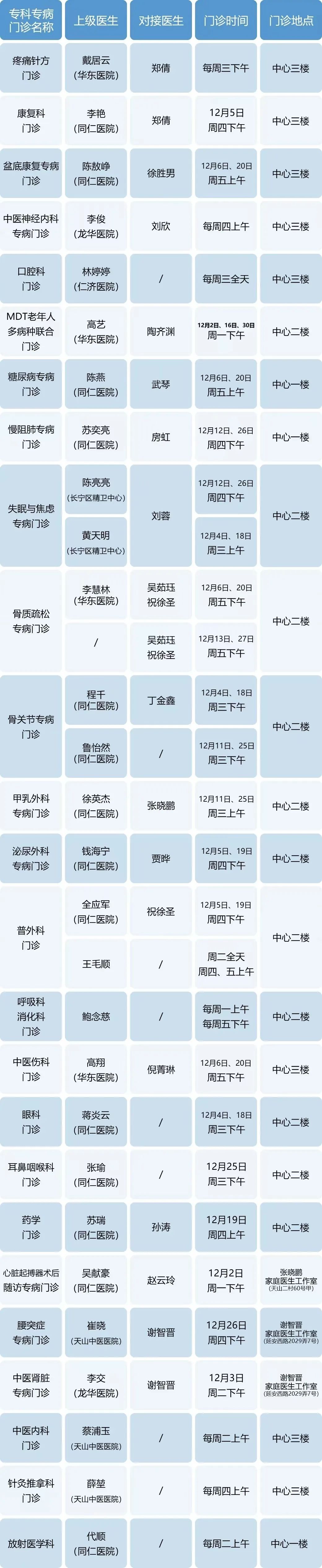 如今在长宁,走进家门口的社区卫生服务中心就能享受到二、三级医院的优质医疗资源。全区10家社区卫生服务中心12月的专家门诊表来啦~