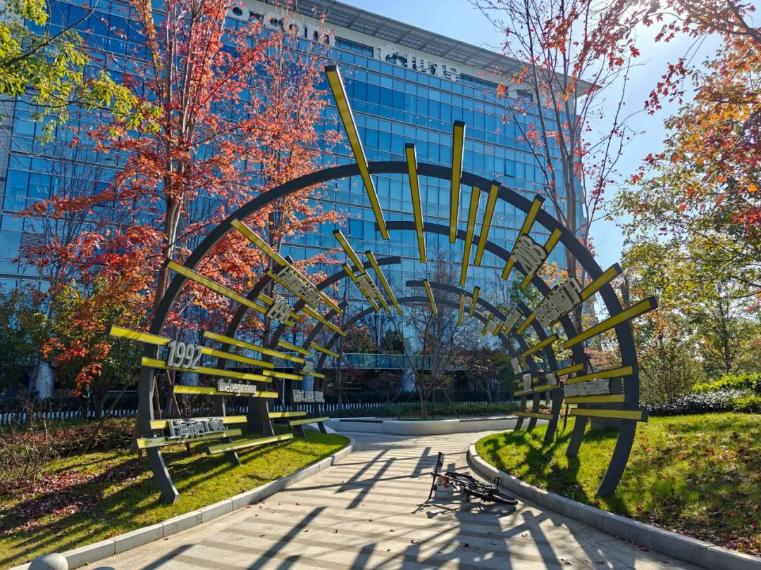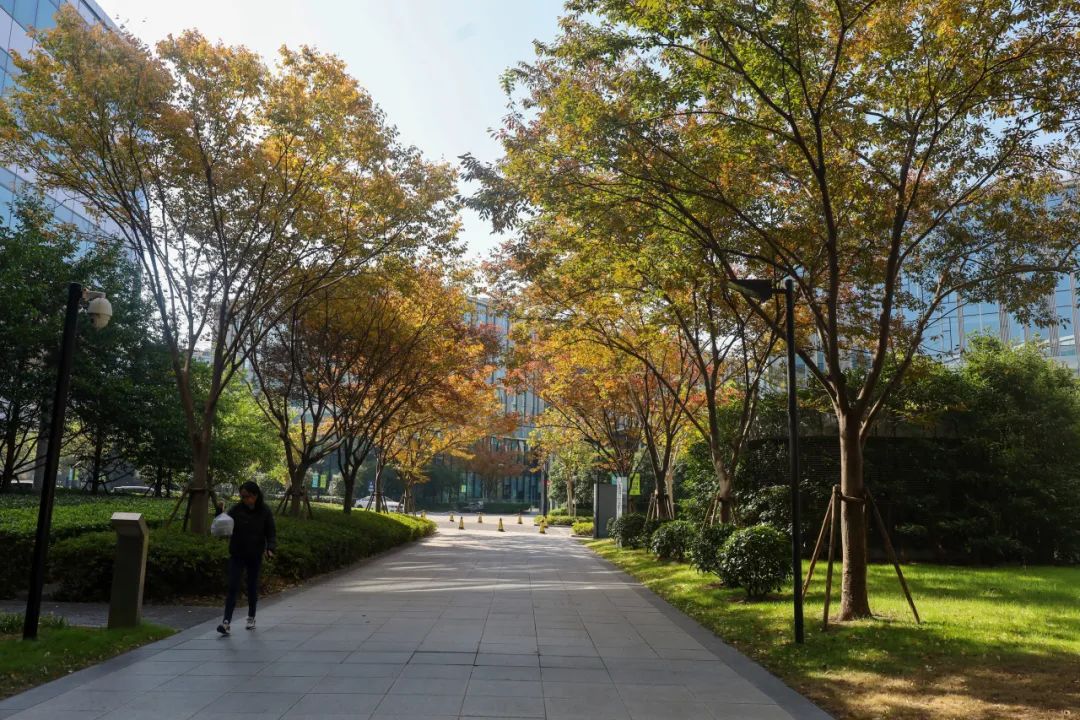 IBP国际商务花园二期有一条秋季限定的“时空隧道”。道路两侧种植着成排的高大榉树,它们在秋天变成橙红色——不仅色彩浓郁,有油画一般的美,而且色调温暖,让人犹如沐浴在暖阳之中。工作日的时候, 还会有小猫咪蹲在路中央等待投喂。