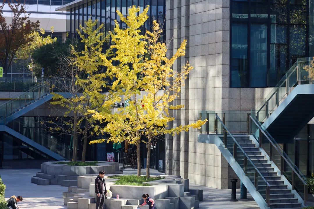 二期也能看到银杏树,而且是完全不同的风格。这几株银杏树位于下沉式广场之中,四周都是充满都市感的建筑物。树与楼之间,形成了暖色与冷色、舒展与自持的强烈对比。
