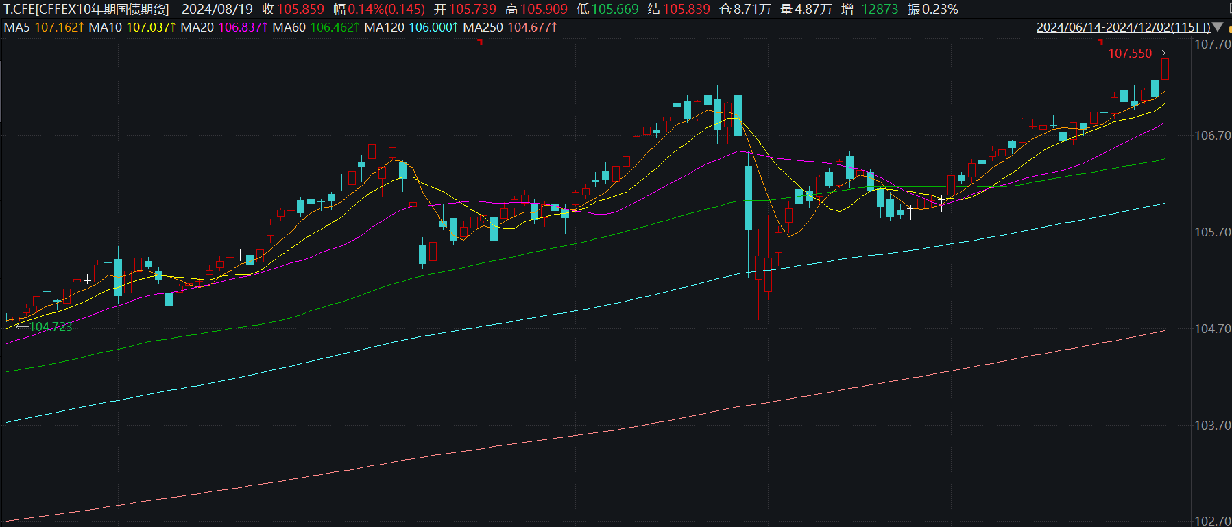 今年以来,国债收益率总体呈现下行趋势。财政部网站显示,2024年以来,10年期、30年期国债收益率由2.56%、2.84%震荡下行。9月23日,10年期、30年期国债收益率分别报2.04%、2.14%,均为阶段低点。同时,9月24日,10年期、30年期国债期货价格最高分别报107.08、116.07,为阶段高点。