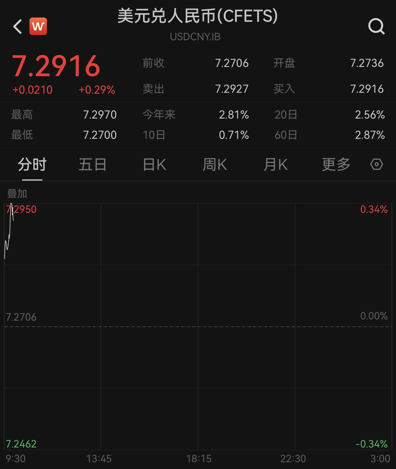 人民币对美元即期汇率开盘后同样走低,开盘后接连跌破7.28和7.29关口,截至发稿,盘中最低至7.2970,较前一交易日下跌超284点,创下去年11月中旬以来的新低。