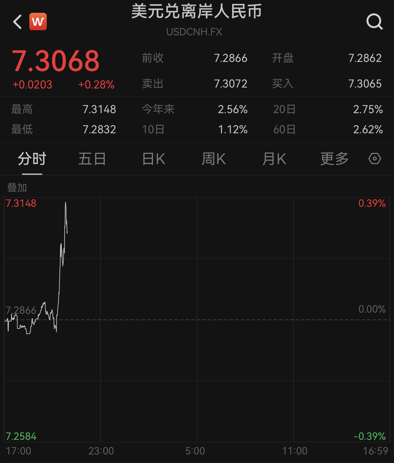 离岸人民币对美元汇率时隔近5个月再度跌破7.3关口。