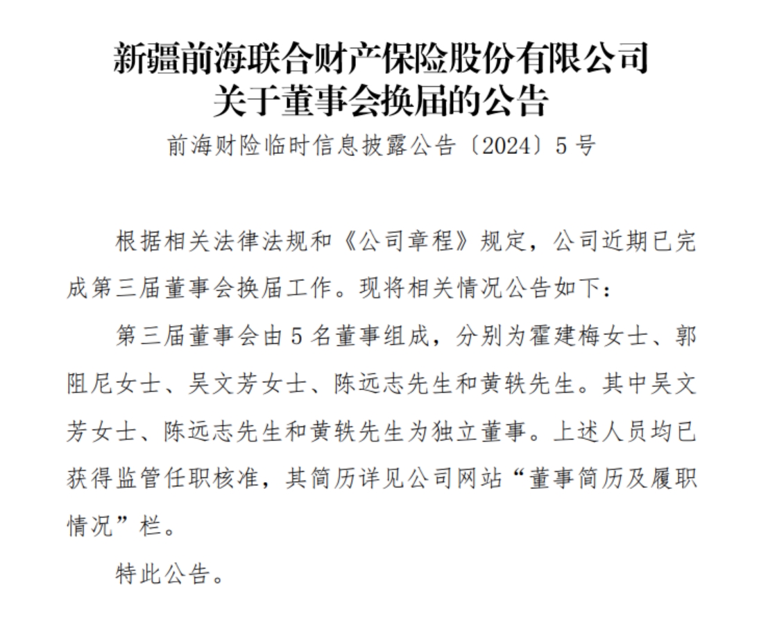 日前,新疆前海联合财产保险股份有限公司(简称“前海财险”)董事会换届尘埃落定。换届公告显示,前海财险第三届董事会由五名董事组成,分别为霍建梅(新晋)、郭阻尼、吴文芳、陈远志(新晋)和黄轶(新晋)。上一任董事长黄炜已消失在名单中,来自“平安系”的霍建梅位列五位新董事之首。
