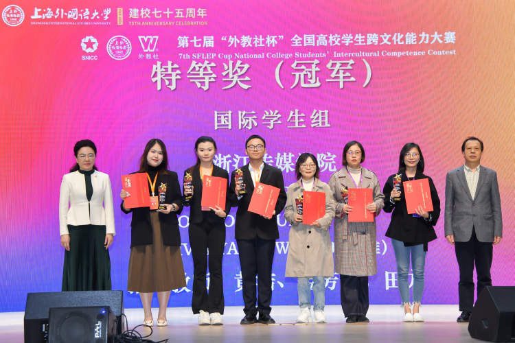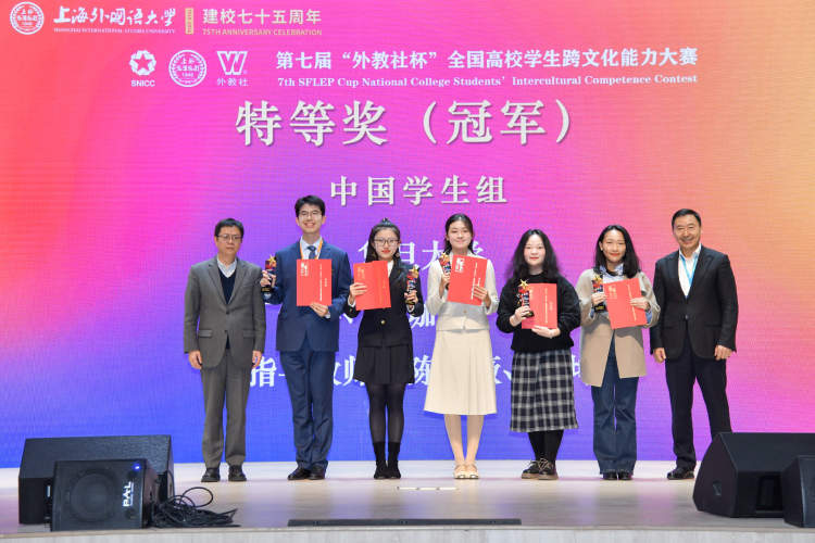 第七届“外教社杯”全国高校学生跨文化能力大赛全国决赛、总决赛颁奖典礼昨天在上海外国语大学虹口校区举行。经过案例开发与展析、名言名句解读、知识问答、情境述评和讲述中国故事等多项比赛环节的考察,复旦大学团队和浙江传媒学院团队分别摘得中国学生组和国际学生组冠军。