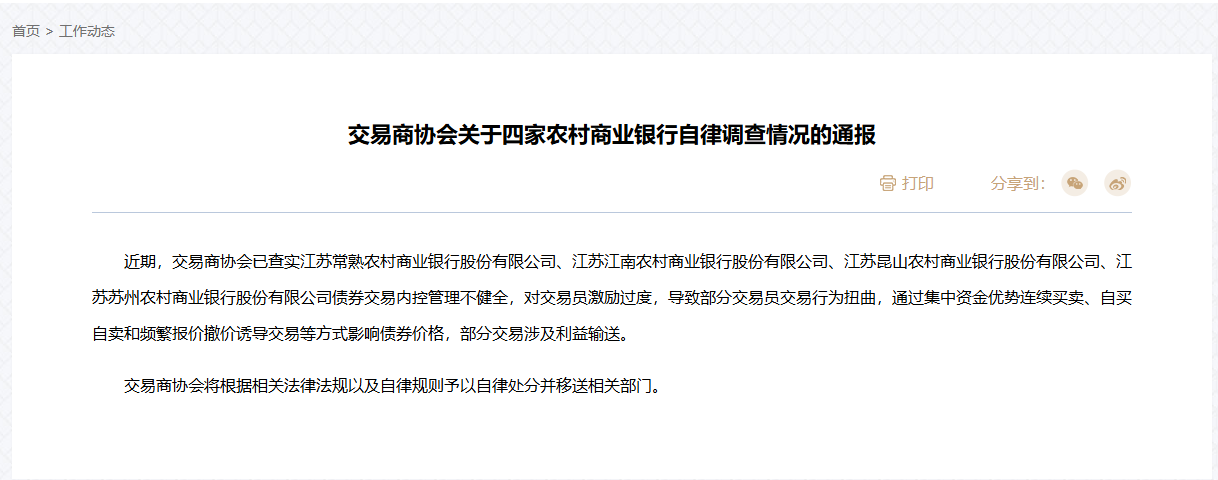 通报称,近期,交易商协会已查实江苏常熟农村商业银行股份有限公司、江苏江南农村商业银行股份有限公司、江苏昆山农村商业银行股份有限公司、江苏苏州农村商业银行股份有限公司债券交易内控管理不健全,对交易员激励过度,导致部分交易员交易行为扭曲,通过集中资金优势连续买卖、自买自卖和频繁报价撤价诱导交易等方式影响债券价格,部分交易涉及利益输送。