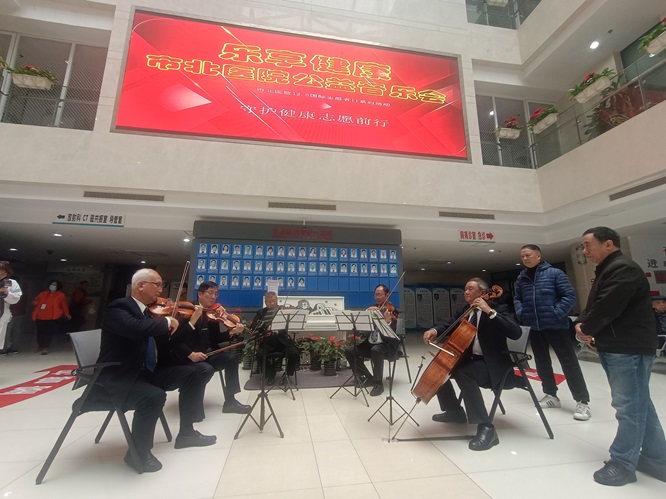 今天上午,上海市静安区市北医院新时代文明实践站内,悠扬的琴声如同春风拂面,为冬日的医院带来了一抹温暖,这里正上演着一场名为“乐享健康”的小型公益音乐会。来自彭浦新村街道“茉莉花”交响乐团的5名志愿者(注:平均年龄71岁),以音乐为媒介,为患者们带来了一场视听盛宴。他们中有的是专业音乐老师,有的是业余爱好者,有的还是曾经的医院患者或家属。今天,他们共同化身为志愿者,用音乐传递爱与健康。