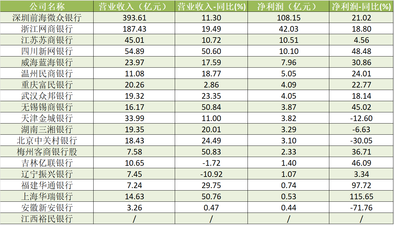自2014年深圳前海微众银行(下称“微众银行”)、温州民商银行、天津金城银行(下称“金城银行”)获批筹建来,中国民营银行的发展已经走过了10年。从十年发展情况看,民营银行出现分化趋势。Wind数据显示,2023年,18家披露年报的民营银行中,仅有微众银行净利润超过100亿元,为108.15亿元,包括新安银行在内的12家民营银行净利润未超过5亿元;从净利增速看,上海华瑞银行、福建华通银行净利增速同比增超90%,分别为115.65%、97.72%,湖南三湘银行、金城银行、北京中关村银行、新安银行净利同比增速为负。处于尾部的民营银行路在何方?