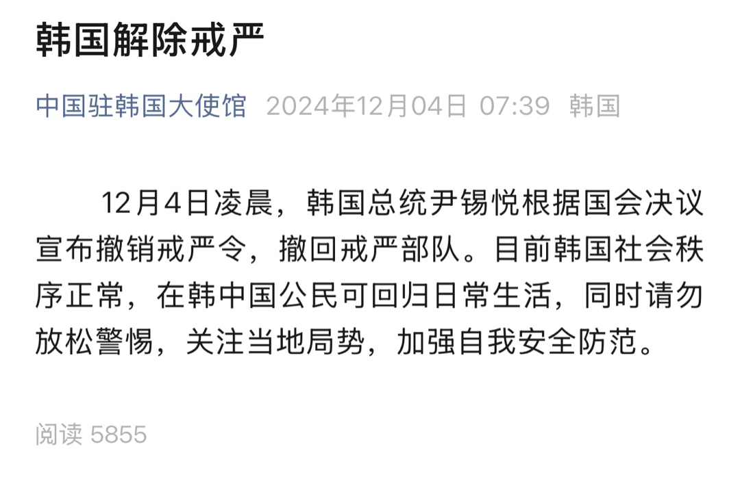 4日早晨7时许,中国驻韩国大使馆回应韩国解除禁令:今天凌晨,韩国总统尹锡悦根据国会决议宣布撤销戒严令,撤回戒严部队。目前韩国社会秩序正常,在韩中国公民可回归日常生活,同时请勿放松警惕,关注当地局势,加强自我安全防范。