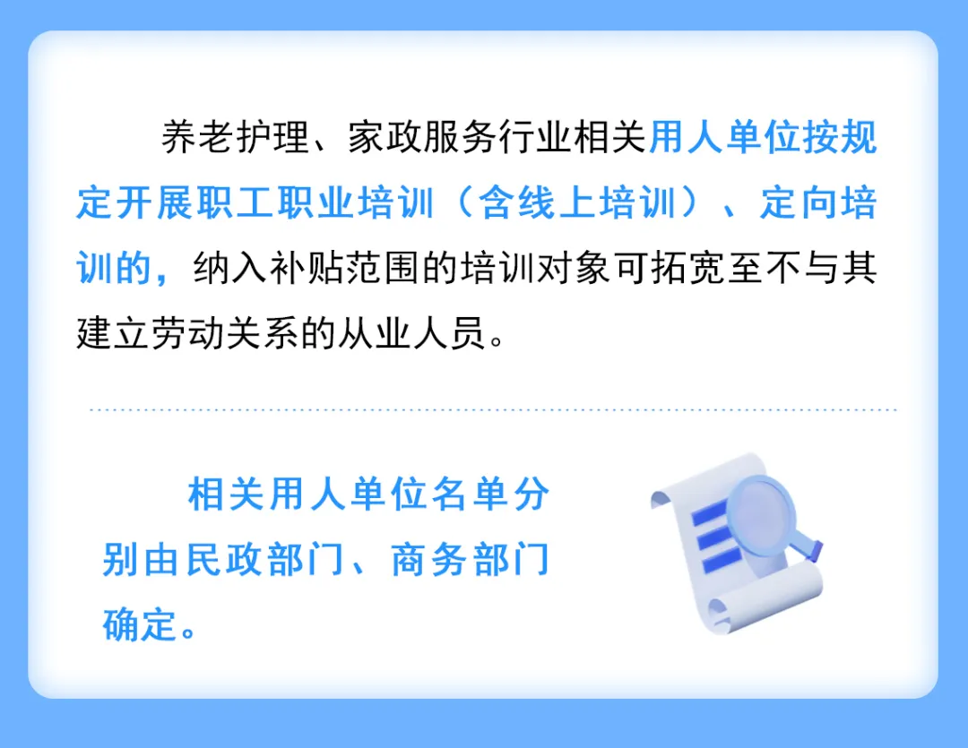 (五)养老护理、家政服务行业相关用人单位按规定开展职工职业培训(含线上培训)、定向培训的,纳入补贴范围的培训对象可拓宽至不与其建立劳动关系的从业人员。养老护理、家政服务相关从业人员及所在单位登记(备案)情况、从业状态等信息分别以民政部门的“上海市养老护理员信息管理系统”、商务部门的“上海市家政服务管理平台”数据为准。相关用人单位名单分别由民政部门、商务部门确定。