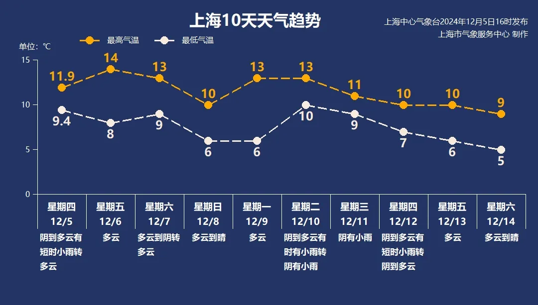 昨夜(12月4日)今晨上海市出现弱降水,厚厚的云层挡住了升温通道,今日(12月5日)温差较小。徐家汇站白天最高气温仅11.9℃,最低9.4℃。气温偏低加上空气湿度增加,体感上有些阴冷。随着云雨区东移南压,下午起天空状况略有好转。