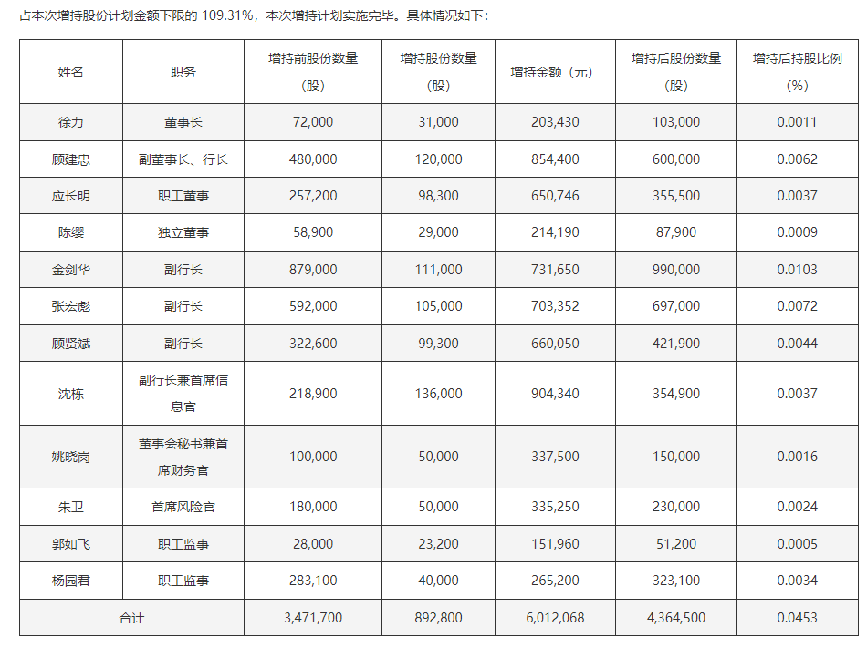 12月5日晚间,上海农商银行发布关于高级管理人员和部分董事、监事自愿增持公司股份计划实施完毕暨增持结果的公告。