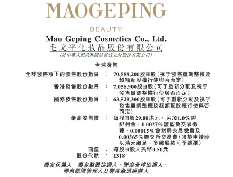 12月2日,毛戈平在港交所公告,拟香港IPO发售7058.82万股股份,发行价区间为每股26.3~29.8港元,于12月2日~12月5日招股,每手100股,预计股份将于12月10日(星期二)上午9时正开始在港交所买卖。这意味着毛戈平即将成为“港股国货彩妆第一股”。
