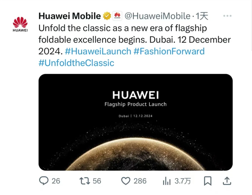 华为12月12日将在迪拜召开发布会,届时将推出多款新品。华为至少有两年没在海外召开终端产品的发布会了,此次发布会消息一出,迅速引发了业界的关注。2019年,华为手机出货量冲到了全球第二,在海外积累了数以亿计的用户,海外用户也期待华为能王者归来。此次华为海外发布会海报和11月26日的国内发布会预热海报非常像,不过海报文案有所不同,上面写着“揭开经典,开启旗舰折叠屏卓越新时代”。