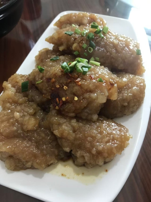 芋艿蒸熟,打烂捏碎,与淀粉一起调配,混杂进白萝卜丝、豆腐、肉丝,做成糊状,摊在蒸锅里蒸熟,就是我们小城人民最爱的肉圆。肉圆热乎乎地蒸熟,撒上一把辣椒,再撒上一把小葱,切两块端上来就是绝美小吃。宜蘸着醋吃。衢州城里以前就有一家,冬天时人们排着队等肉圆出笼,一人手上拿一个透明的塑料袋子,切一块就端在手上吃。那可烫手!站在街边上,撮起嘴巴吹气,一会儿吹着肉圆,一会儿吹着手指头,一会儿又要吃肉圆,忙得很,可是也美味得很。