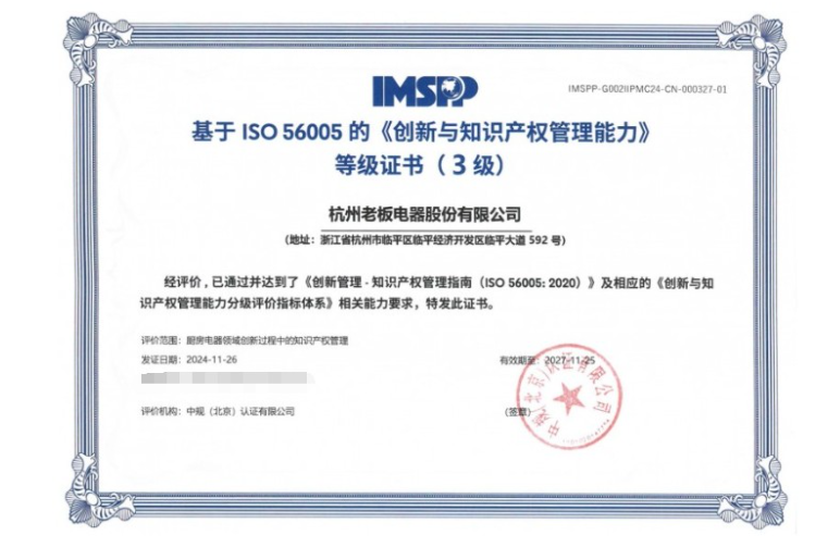 近日,杭州老板电器股份有限公司成功通过ISO56005“创新与知识产权管理能力”分级评价,荣获三级认证证书。这不仅是浙江省“电气机械和器材制造业”领域的首张三级证书,更是全国“厨房电器领域”的首张证书,标志着老板电器在创新与知识产权管理方面取得了卓越成就。