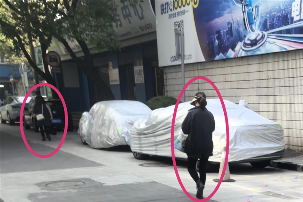 图说:犯罪嫌疑人黄某某(后)与阮某某接头后准备交接赃款(崇明警方供图,同下)