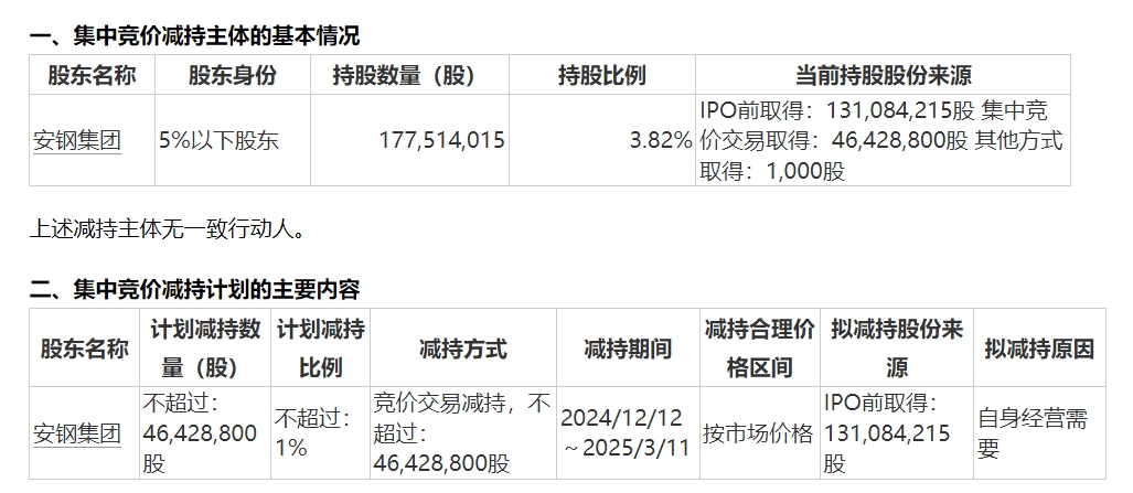 12月6日,中原证券发布《股东集中竞价减持股份计划公告》,公司股东安阳钢铁集团有限责任公司(简称“安钢集团”)计划自《股份减持计划告知函》出具之日起3个交易日后的3个月内,通过集中竞价交易方式减持公司股份数量不超过4642.88万股,即不超过公司总股本的1%。