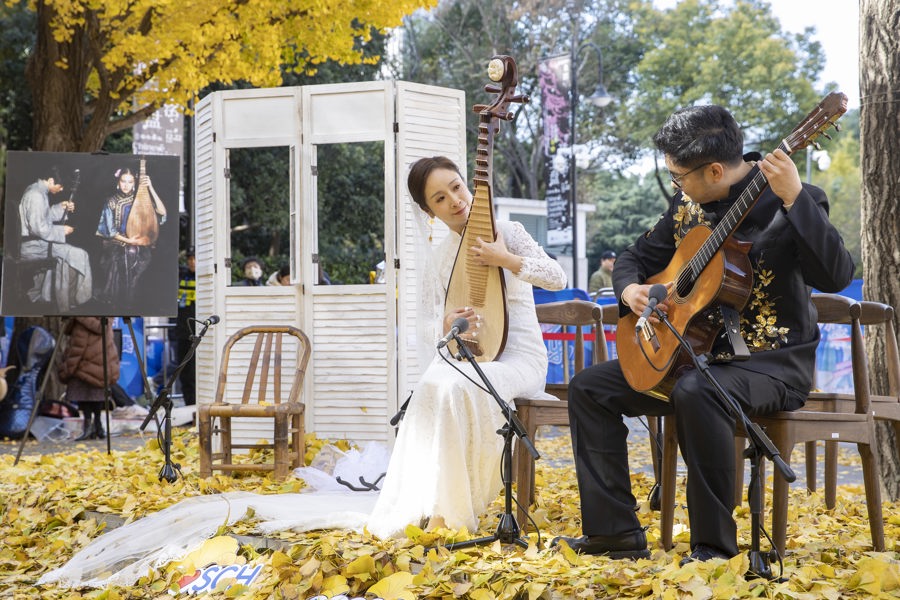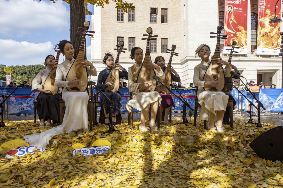 12月8日,“银杏音乐会”在上海音乐厅南广场西侧银杏林下举行,艺术家在遍地金黄落叶铺垫的舞台上为观众带来演奏。