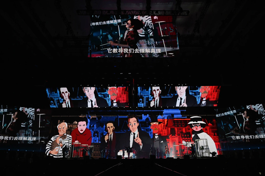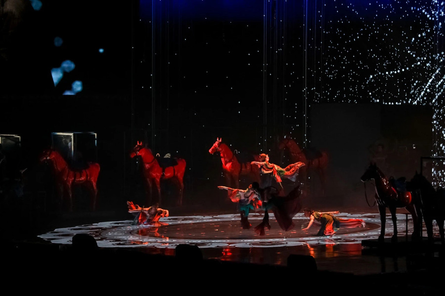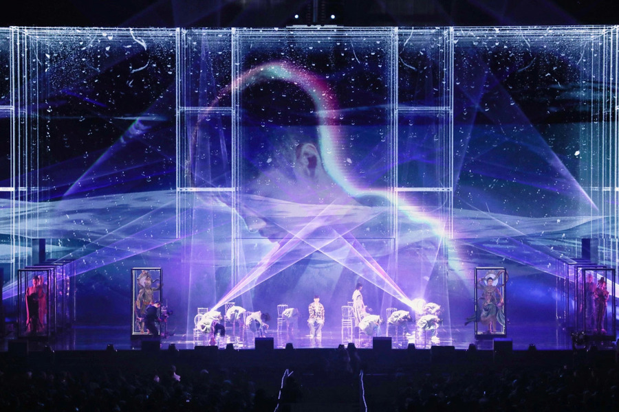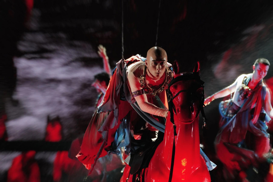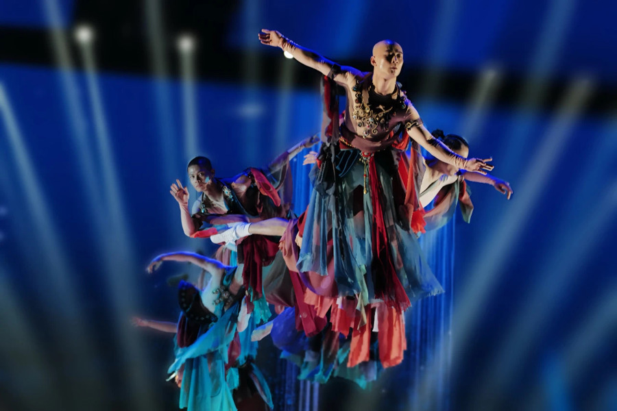 《受到召唤·敦煌》也是中国国家话剧院首次在国家级体育场馆内演出的作品,通过AI、影视化、动画真人融合等最新科技赋能舞台,带领观众步入真正的“戏剧元宇宙”。创作团队大胆用音乐拓展戏剧边界,利用原创曲目将古典舞和现代舞融汇,结合7路威亚表演,展示出青春、时尚、未来的舞台质感。