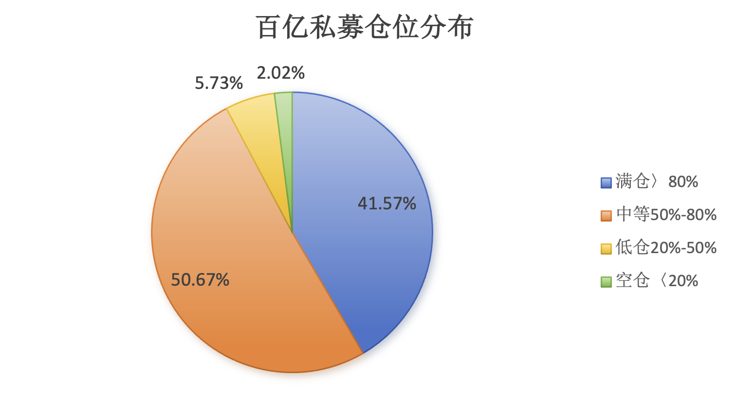 百亿私募主要以中等仓位为主。私募排排网数据显示,截至11月29日,中等仓位百亿私募占比为50.67%;满仓百亿私募占比为41.57%;但低仓和空仓百亿私募非常少,合计占比不足8%。