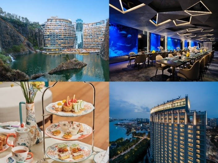 从左至右顺时针:上海佘山世茂洲际酒店&渔火特色餐厅;苏州洲际酒店&“花园艺术”湖景下午茶