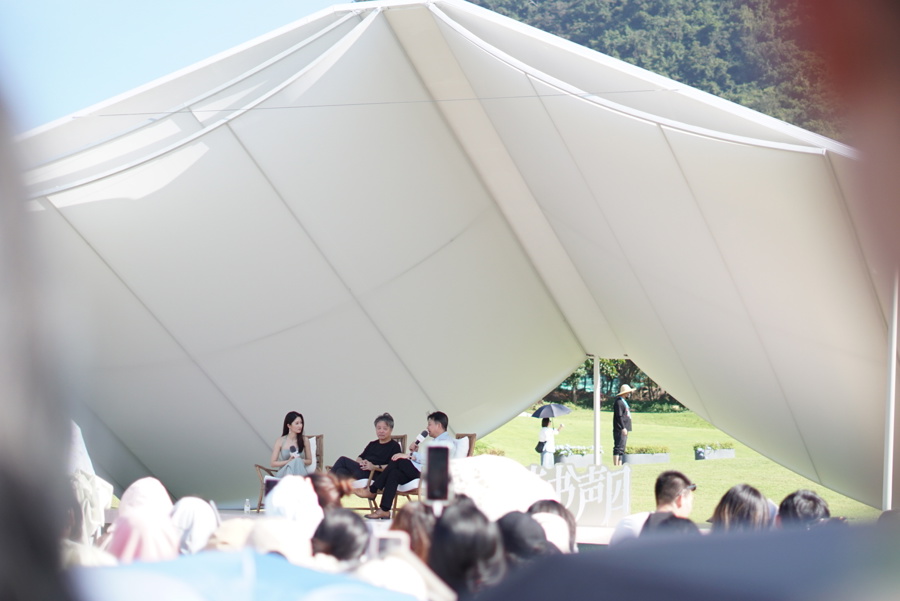 余华的出现在现场引起了轰动,读者们飞快地朝着他所在的小山坡蜂拥而去,晚到一些的人,只能踮起脚尖,在人与人之间的缝隙中,看余华与学者刘擎谈论“阅读的意义”。