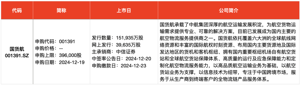 澎湃新闻根据Wind及公开信息梳理统计,本周(12月16日-12月20日),安排3只新股网上申购。申购的新股为包头天和磁材科技股份有限公司(简称“天和磁材”,603072.SH)、中国国际货运航空股份有限公司(简称“国货航”,001391.SZ)、方正阀门集团股份有限公司(简称“方正阀门”,920082.BJ)。