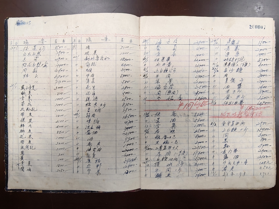 比如,第一本账是1954年11月28日起记的生活收支账。当天,“豆腐账”上记录着:煤球炉15000元、窗帘66500元等;1955年2月27日的账上记录着:赤砂糖2000元……这是当时国家使用旧币时的账目。