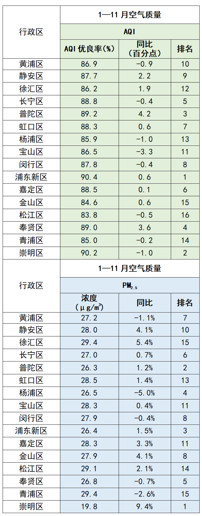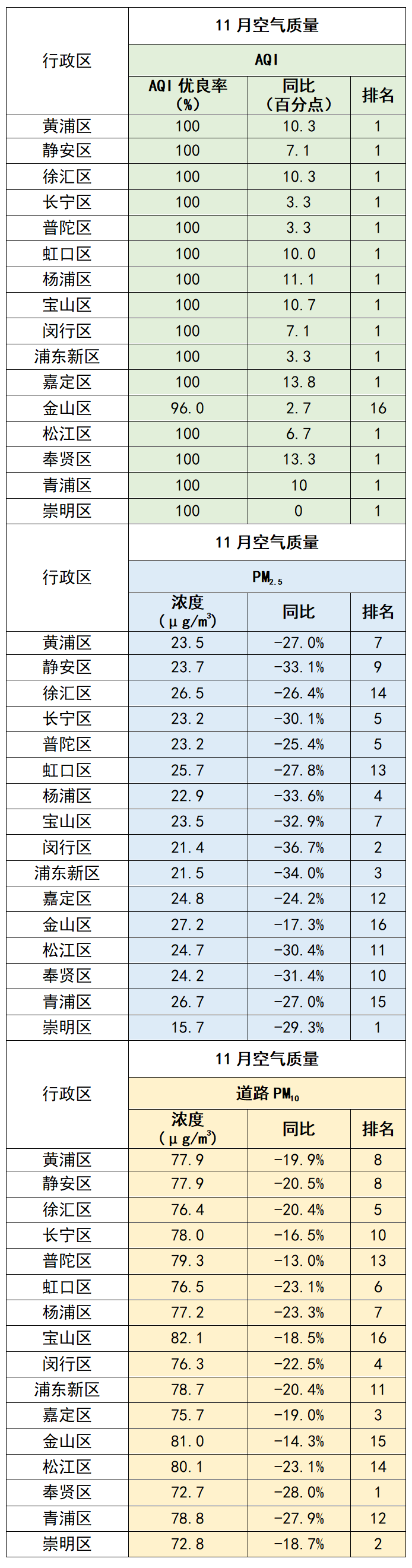 今年1-11月,各区AQI优良率由高到低排名,前3名为浦东新区、崇明区、普陀区,松江区、金山区、青浦区分列倒数第一至倒数第三。今年前11个月,AQI优良率有8个区同比改善,按AQI优良率同比改善情况排名,前3名为普陀区、奉贤区、静安区;有8个区AQI优良率同比下降,降幅最大的3个区(含并列)为宝山区、杨浦区、崇明区。