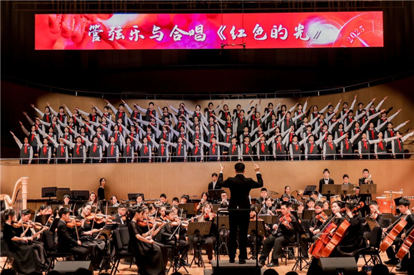 校管弦乐团、校合唱团、预备11班和进才实验中学南校部分同学共同演绎《红色的光》。