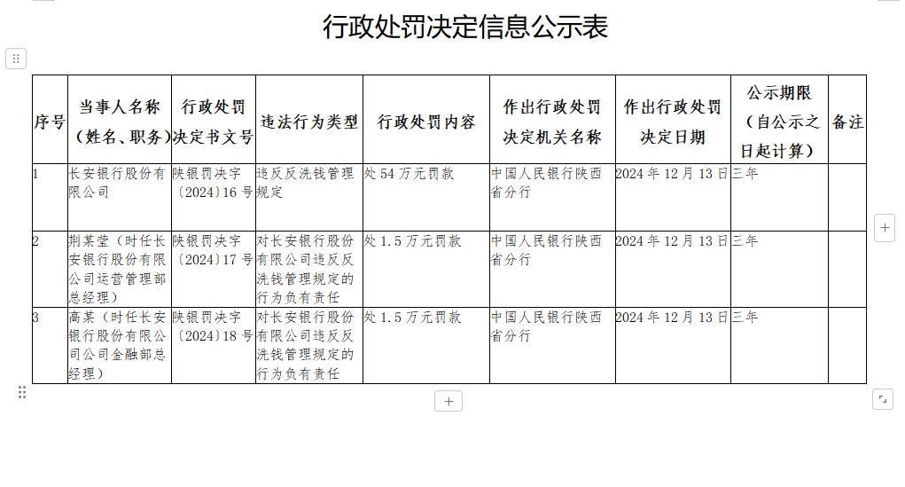 12月17日,据中国人民银行陕西省分行行政处罚决定信息披露,长安银行因违反反洗钱管理规定,被罚款54万元。2名员工分别被处以1.5万元罚款。