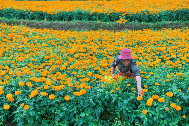 2024年7月30日,村民在贵州省威宁县双龙镇高坡村采摘万寿菊。新华社记者杨文斌摄