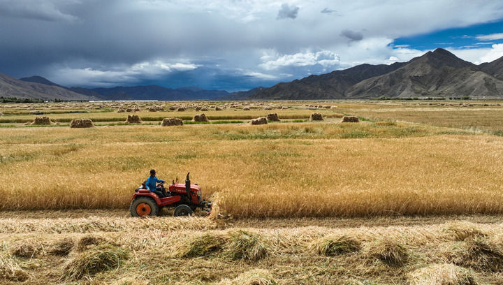 2024年9月10日在西藏日喀则市白朗县巴扎乡拍摄的秋收场景(无人机照片)。新华社记者晋美多吉摄